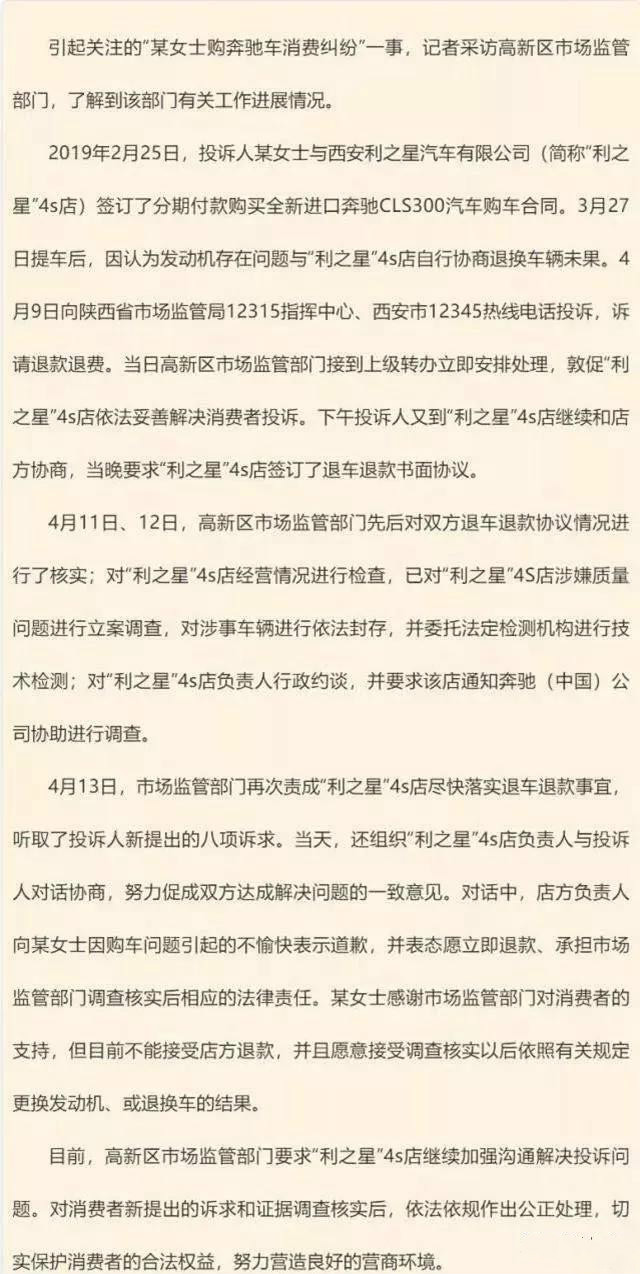 第二個好消息是:當地有關部門已經組成工作組,介入此事的調查處理。@西安發佈深夜公佈西安市監局對“奔馳車主哭訴維權”處理:責成退車退款。但不知何故,博主在淩晨刪除了此微博。今天早上又重新發佈。中間發生了什麼情況,暫時不得而知: