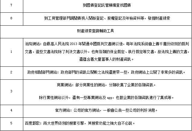 除了上表中的財產線索查找方向,在平時工作中,我們還可以借助一些輔助工具及手段進行查找,說不定會有事半功倍的效果呢。
