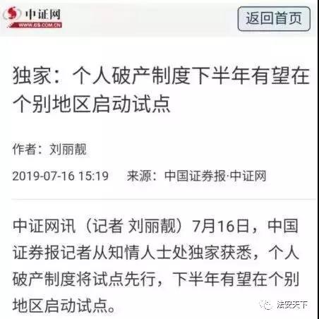 有媒體報導,記者從知情人士處獨家獲悉,個人破產制度將試點先行,下半年有望在個別地區啟動試點。