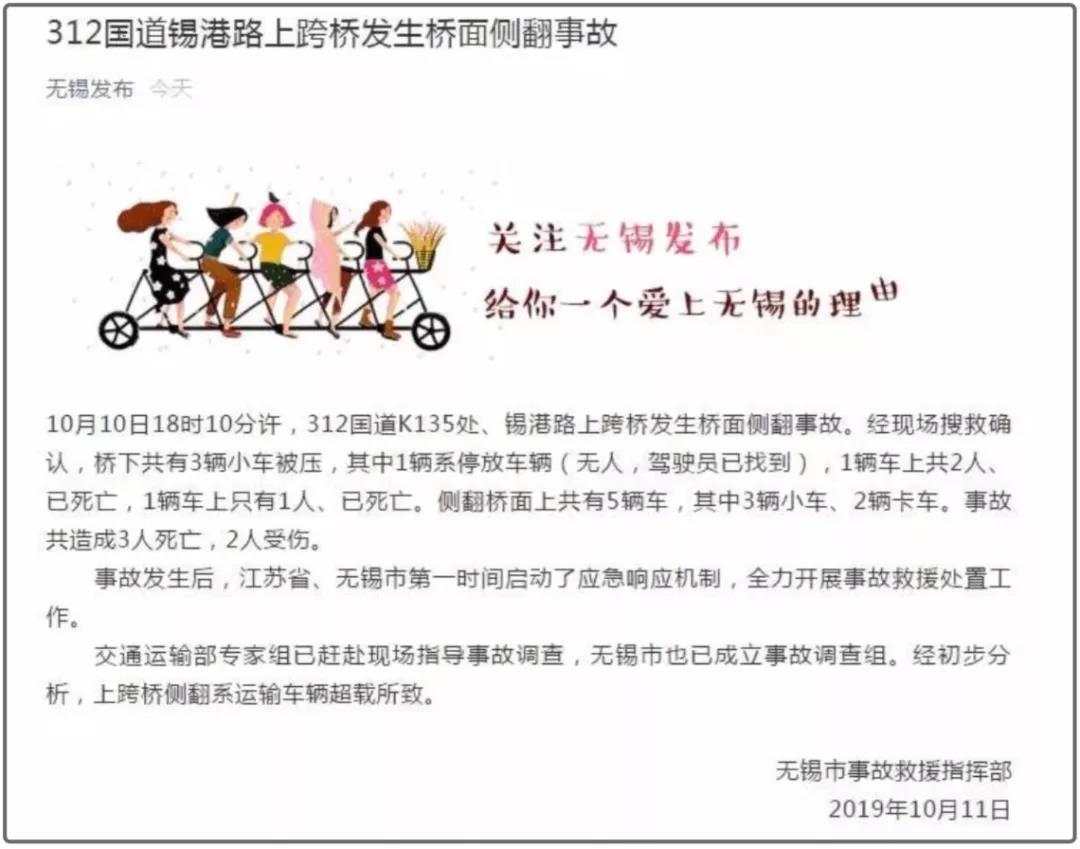 據事故救援指揮部發佈的資訊,交通運輸部專家組已趕赴現場指導事故調查,無錫市也已成立事故調查組。經初步分析,上跨橋側翻系運輸車輛超載所致。