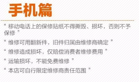 無效格式條款七:小白吃完飯,看到手機店在搞促銷,尋思著自己換個像素高的手機能方便給女友拍照,於是前往手機店買了一部新手機,看到店內有這樣的提示語:“促銷手機,不負責三包。”