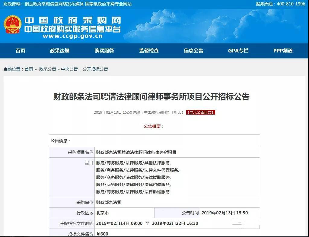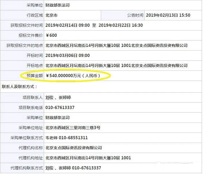 之前,政府採購網發佈《財政部條法司聘請法律顧問律師事務所專案公開招標公告》,公告中顯示,財政部條法司聘請法律顧問律師事務所作為法律顧問的擬預算金額為¥540.000000萬元。