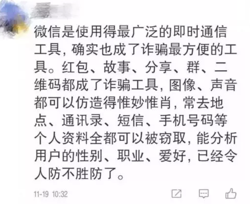 11月19日,最高法發佈《司法大數據專題報告之網路犯罪特點和趨勢》顯示,近20的網路詐騙案件是在獲取公民個人信息後進行的詐騙。其中,微信超過QQ成為網路詐騙犯罪中使用最為頻繁的犯罪工具。而在21世紀經濟報導發起的關於網路詐騙的調查中,讀者提起來也是深惡痛絕。