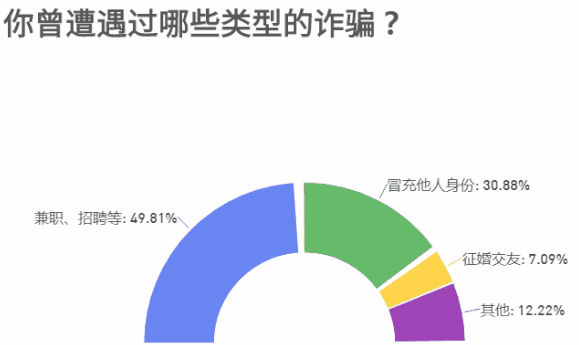 在最高法的報告中,網路詐騙案件被告人也多以冒充他人身份等方式欺騙受害人,招聘類型案件占比逐年上升,而在21世紀經濟報導發起的調查中,近半數人遇到關於兼職或招聘類型的詐騙。