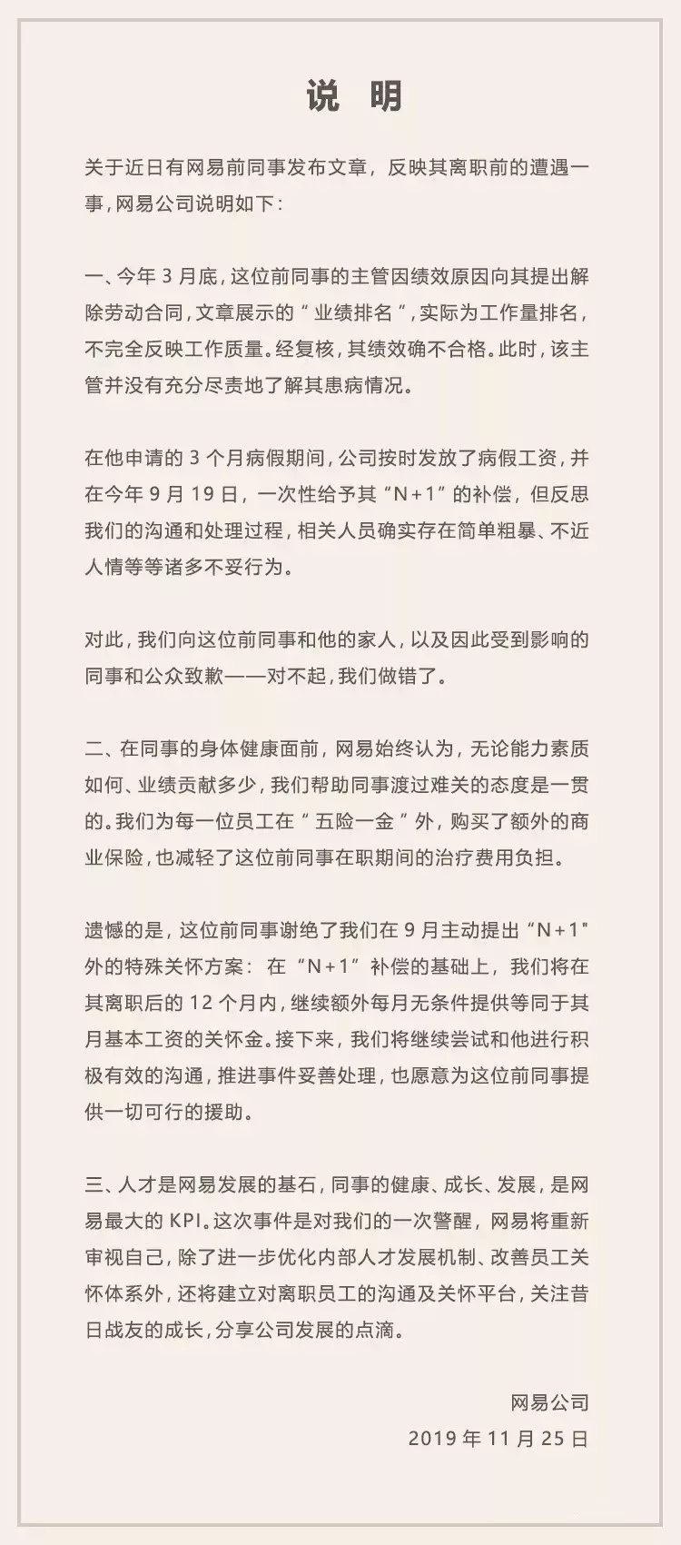 25日,針對暴力裁員事件,網易做出說明稱,相關人員確實存在簡單粗暴、不近人情等等諸多不脫行為,並作出道歉。