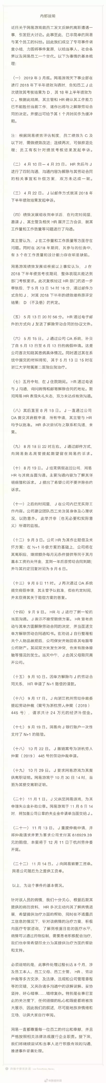 道歉說明發佈不久,網上就有爆出一封網易公司面向員工的內部說明。稱此事件處理過程持續8個多月,涉及到員工本人、員工父母、員工主管、HR、仲裁等多方。中間又夾雜著諸多溝通、諒解、妥協等等。
