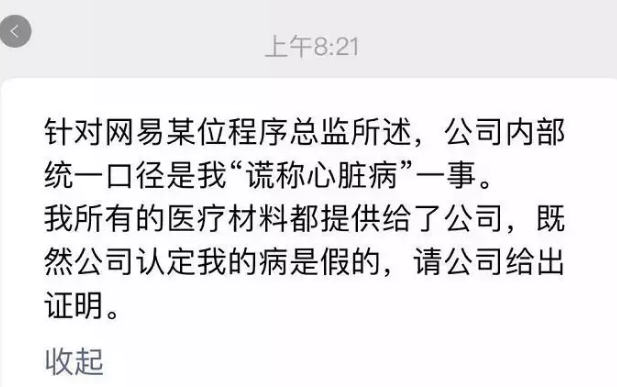 文章中表述到,該控訴者在2014年上海交大畢業後即進入網易工作。在身患絕症的情況下,經歷了上司逼迫、算計、監視、陷害、威脅、甚至被保安趕出公司。