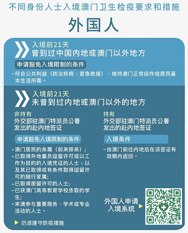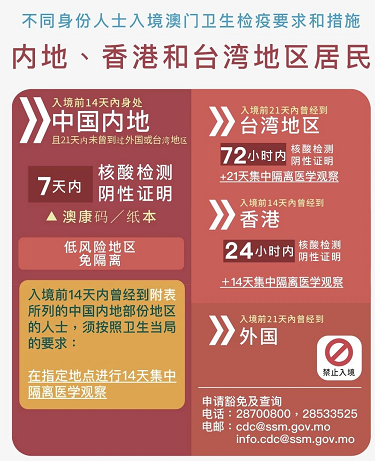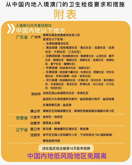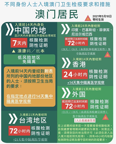澳門新型冠狀病毒感染應變協調中心宣佈,因應廣東省廣州市及佛山市的疫情變化,衛生局根據第2/2004 號法律《傳染病防治法》第14 條的規定,自 2021年5月29日21時起,所有在入境前14天內曾經到過廣東省廣州市荔灣區海龍街道(包括增滘社區、海北社區、龍溪社區、龍灣社區、大和社區、江北社區)、佛山市南海區桂城街道華福禦水岸社區的入境人士,須按照衛生當局的要求在指定地點接受14 天醫學觀察,違反者除可能依法承擔相應的刑事責任外,尚可被採取強制隔離的措施。