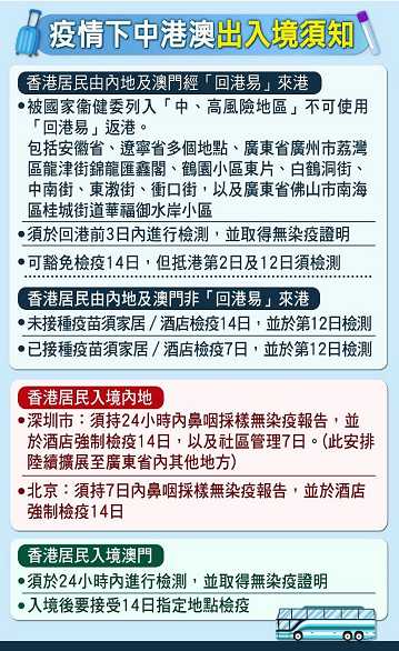 應變協調中心呼籲,市民前往外地應注意做好防疫措施,留意當地疫情發展。在抗疫常態下,仍須堅持戴口罩,嚴格執行各項防疫措施,保持距離,避免人流聚集。同時,強調應在現階段有序地預約接種疫苗,疫苗可有效預防新冠病毒肺炎,有效減少自身感染、重症和死亡風險,築起免疫屏障,保護自己及家人。同時,即使已接種疫苗,亦應避免前往高風險地區,如必須前往,應在完成接種疫苗後14天,待身體產生足夠的免疫力後才前往,以減少感染的風險。