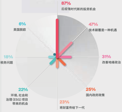 2021年超高淨值人士最感興趣的機會,排在首位的是後疫情時代的投資機會(為87%的富豪首選),緊跟其後的是技術顛覆機會(47%),地緣政治改善(31%),國內政策支持(25%)。
