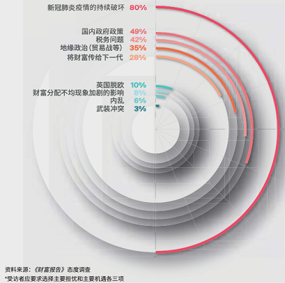 2021年超高淨值人士最擔心的財富創造和保值問題,新冠疫情的蔓延為80%的富豪的首選風險;國內政府政策(49%)和稅務問題(42%)位列第二、第三。