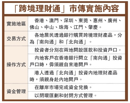 「跨境理財通」的構想,早於2019年2月頒布的《粵港澳大灣區發展規劃綱要》中提出。及至去年6月底,人民銀行、香港金管局和澳門金管局在聯合聲明中就「跨境理財通」公布細則,凡在銀行開立投資專戶者,可購買合資格投資產品,又確立通過帳戶綁定實現閉環匯劃和封閉管理、資金匯劃,同時使用人民幣跨境結算。