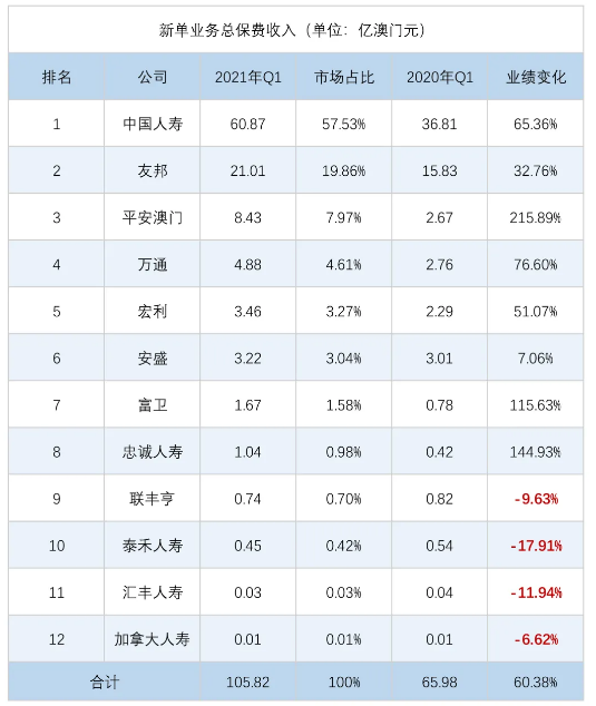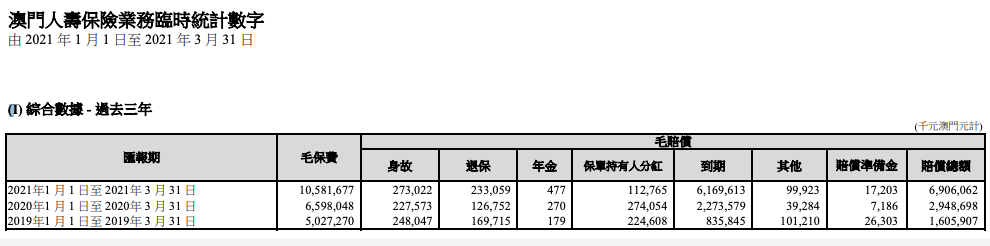 澳門金管局數據顯示,2021年1月1日至2021年3月31日,澳門人壽保險毛保費為106億澳門元,較上一季度(48億)暴漲123%,較去年同期(66億)增長60%。