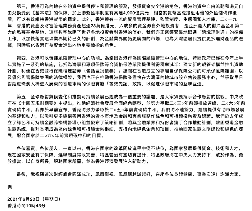 香港特別行政區行政長官林鄭月娥以視頻連線的方式出席“2021鳳凰網(夏季)財經峰會”。
