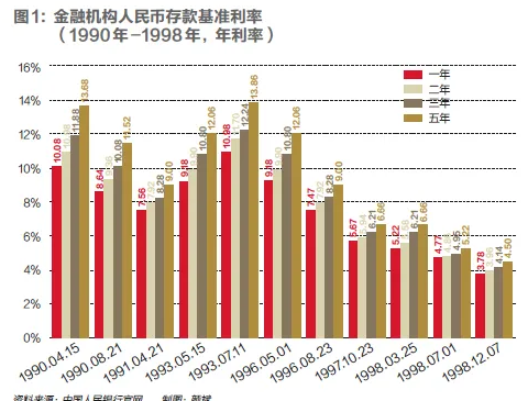 根據中國人民銀行數據,1993年時一年期存款的利率就高達10%以上,三年期存款利率為12.24%(見圖1)。彼時,高利率同步對應宏觀經濟週期的高通脹,為了吸引儲戶存款,銀行甚至推出 “保值儲蓄”,並加送大禮包。