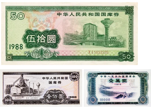 1981年以後至1996 年的十多年內,發行的國庫券都是實物券,面值有1 元、5 元、10元、5 0 元、1 0 0元、1000 元、1萬元、10萬元、100萬元等。