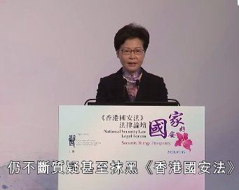 林鄭月娥表示,《香港國安法》實施後,香港社會恢復穩定,黑暴絕跡,市民的生命和財產得到保障,並可再次依法享有他們的基本權利和自由。