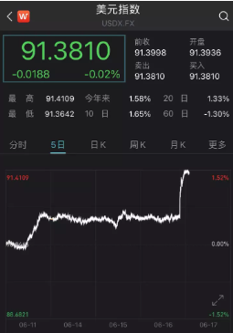 5月份美國CPI大漲5%,增速創下2008年8月以來最高,核心CPI達3.8%,增速創下1992年以來最高。美聯儲官員6月17日暗示,隨著經濟迅速復蘇並且通脹升溫,他們預計將在2023年底之前加息,比3月時預期的時間要早。這一信號的釋出,導致美元指數大幅飆升到91以上,當日人民幣對美元匯率大貶303個基點,離岸市場做多人民幣機構接連爆倉。18日,人民幣對美元匯率再貶131個基點,盤中一度突破6.45元,將一個多月以來的漲幅全部抹去。