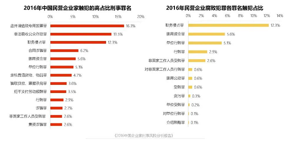 2016年發佈的《2016中國企業家刑事風險分析報告》中顯示,30-50歲之間是企業家風險高發年齡段,其中所觸犯的高占比刑事罪名前三位“虛開增值稅專用發票罪 16.3%”“非法吸收公眾存款罪 13.5%”及“職務侵佔罪 12.3%”。到了2020年度,該專案報告的企業家犯罪的前三名高頻罪名分別是:非法吸收公眾存款罪、職務侵佔罪、拒不支付勞動報酬罪。我們的民營企業家需要格外注意這份分析報告中提到的刑事風險來源。