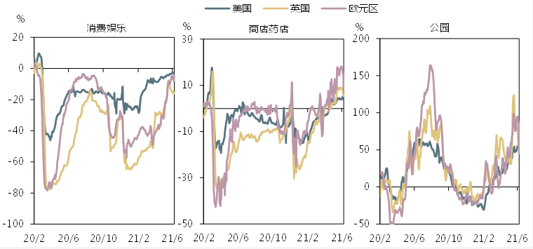 圖表 1:發達經濟體主要國家線下接觸性場所逐步解封