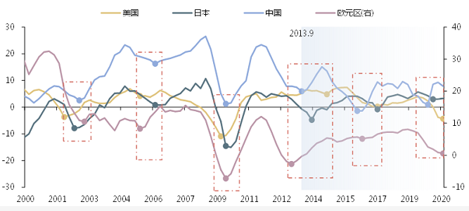 相對於2020年疫情爆發後各國財政刺激導致部分商品需求透支所釋放的紅利而言,服務需求釋放的紅利更傾向於對本土經濟增長的貢獻。2020年下半年由於商品需求的增長和供應鏈瓶頸問題的升級,導致大宗商品價格大幅攀升,相應的資源出口國受惠更多,如巴西等南美國家。對於2021年下半年來說,發達經濟疫情顯著改善後,經濟修復動力將主要是來自於本國服務行業的重啟,與此同時供應鏈瓶頸有望得到好轉,前期透支的商品需求將降低,大宗商品價格也面臨回落壓力,對受疫情影響較重的資源國的“外溢效應”將減弱。