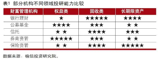 部分機構和領域的投研能力薄弱。一是國內財富管理機構普遍對海外市場研究不足,尤其是美股、美債及大宗商品等領域, 難以滿足客戶日益強烈的全球資產配置需求;同時,對於養老、ESG、碳排放等新興領域的投研能力同樣較為滯後。二是行業頭部機構的投研能力普遍較強,而中小型機構則劣勢明顯。三是券商資管和基金公司權益類資產投研能力相對較強,銀行理財、保險資管等相對較弱。四是除保險資管外,多數財富管理機構對於長期限資產的投研經驗略顯不足。五是一些領先的銀行私人銀行中心、第三方財富管理機構對於高淨值客戶、超高淨值客戶的高端化需求研究和把握較為深入,而其他部分財富管理機構尚未真正進入這一領域(見表1)。