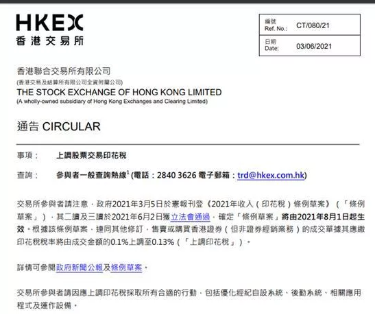 8月1日起,港股印花稅將上調30%,由此前買賣雙方按交易金額各付0.1%,提高至0.13%。早在6月2日晚,香港特區立法會就通過《2021年收入(印花稅)條例草案》,落實本年度財政預算案中,提高股票印花稅至0.13%建議。