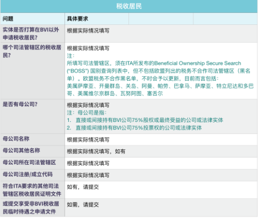 無論是否從事“相關活動”,BVI實體都必須在“財務年度”(financial period)內報告其經濟實質情況,或提供稅收居民及稅收狀況的證據,以證明為“非居民”實體,從而獲得經濟實質報告豁免。