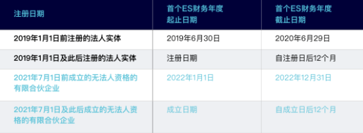 國際稅務局對註冊於不同時期的BVI公司或LPs經濟實質的首個財務年度和截止日期做了如下劃分: