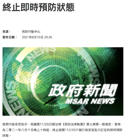上周,澳門因出現變種病毒疫情,在發佈確診消息後的19個小時內啟動了全民核酸檢測計畫,並啟動“即時防禦狀態”。昨天(8月10日)經澳門特區行政長官賀一誠批示,澳門在當晚10時起終止“即時預防狀態”。