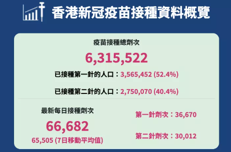 據香港特區政府數據顯示,目前香港疫苗接種總劑次已達到6,315,522次,已接種第一針的人口已達到3,565,452人(占合資格人士的52.4%) ;已接種第二針的人口為2,750,070 (占合資格人士的40.4%)。而最近一天的疫苗接種劑次達到了6.68萬,處於香港接種疫苗計畫開展以來的較高水準。