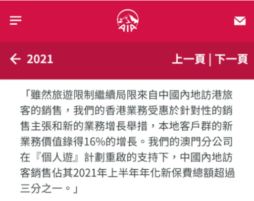 友邦稱,澳門分公司在「個人遊」計畫重啟的支持下,中國內地訪客銷售占2021年上半年年化新保費總額超過三分之一。