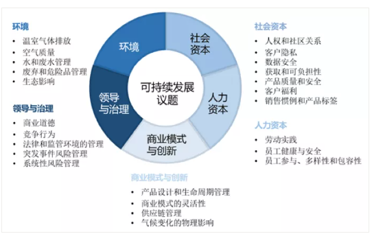 非盈利組織SASB(可持續會計準則委員會)認為,企業應該將可持續發展資訊融入財務報告,並提出了5個維度26個指標,以反映那些“最有實質性關聯的可持續議題”,提請企業關注自身的表現。這5個維度是:環境、社會資本、人力資本、商業模式與創新、領導與治理。