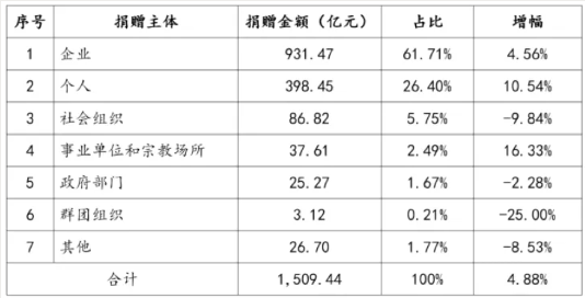 再看中國。根據中國慈善聯合會《2019年度中國慈善捐助報告》,2019年中國共接收境內外款物捐贈1701.44億元,其中,內地接收款物捐贈共計1509.44億元,占GDP的0.15%。最大的捐贈來源為企業,占比為61.71%。