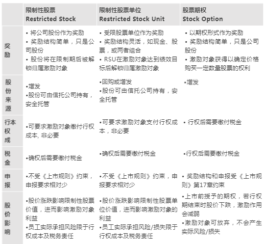 限制性股票RS、限制性股票單位RSU和期權是三種常見的股權激勵方式。根據紅杉中國2021年針對35家上市公司研究表明,近3年IPO的TMT公司使用雙激勵工具(同時授予期權和限制性股票)的公司占比提高至62%;在上市前估值低時多用期權,上市後用RSU逐步替代期權。