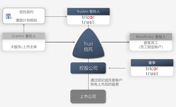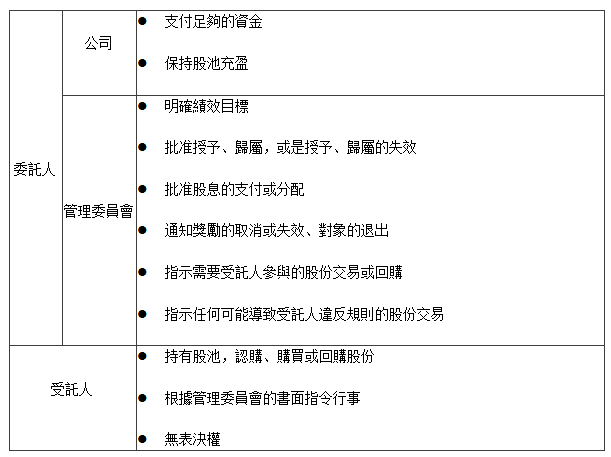 員工激勵信託和私人信託的基礎角色相同,都包含委託人、受託人和受益人。私人信託中起到管理作用的保護人/保護人委員會,在員工激勵信託中則由管理委員會負責計畫的運營。