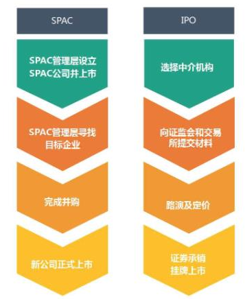 但與傳統意義上的借殼上市不同,SPAC並非買殼,而是先造殼,殼公司上市募集資金,然後再進行並購,使並購對象成為上市公司;而與IPO最大的不同是,IPO是先有實際業務,再上市,而SPAC是先有上市公司,再有實際業務。並且,通過SPAC上市,不僅時間快、費用少、流程簡單,融資也有保證。