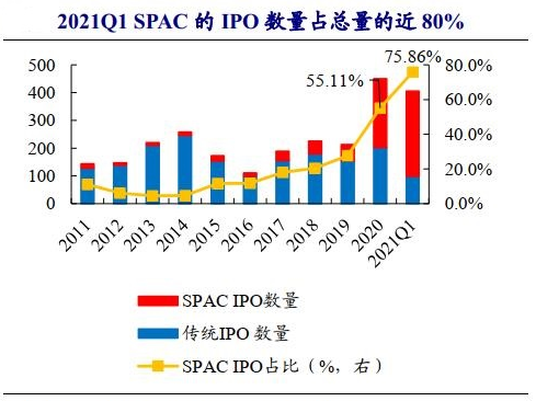 2021年以來,SPAC熱度繼續攀升,僅在第一季度,SPAC IPO數量就達308起,超越了2020年全年SPAC IPO的數量,對應募資額996億美元。