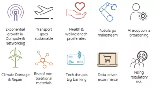 今年5月,瑞銀研究院發佈了一份關於“可改變當今世界競爭格局並帶來長期回報的10個主題”的報告,瑞銀認為量子計算、新型交通、智慧醫療、機器人和自動化、人工智慧、碳中和、新材料、金融科技、電子商務以及政府監管下催生的行業機會將成為影響全球經濟增長的關鍵因素。