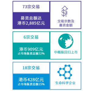 醫療保健及生命科學企業的上市是另一個亮點。共有22家醫療保健及生命科學公司已上市,共募資港幣531億元,占募資總額的18%。