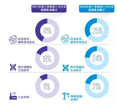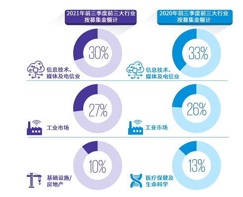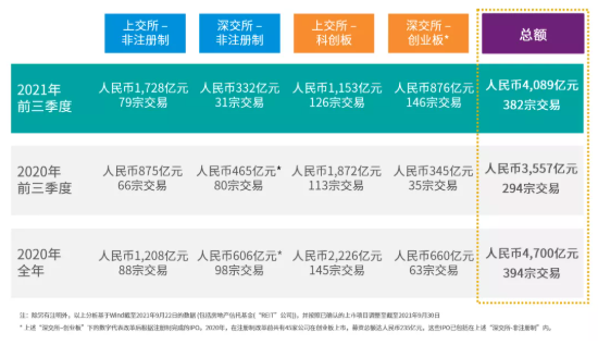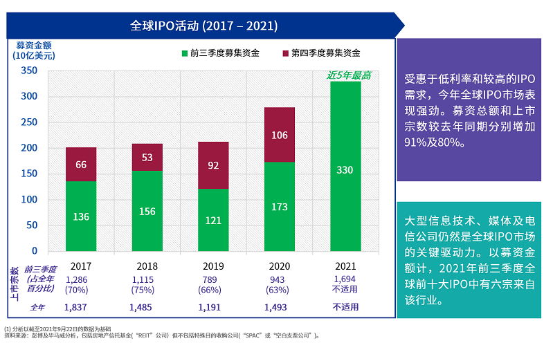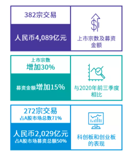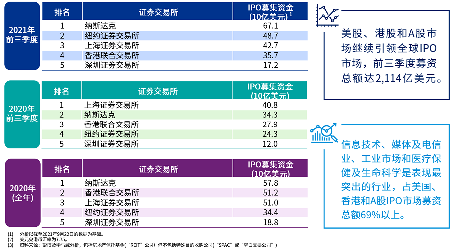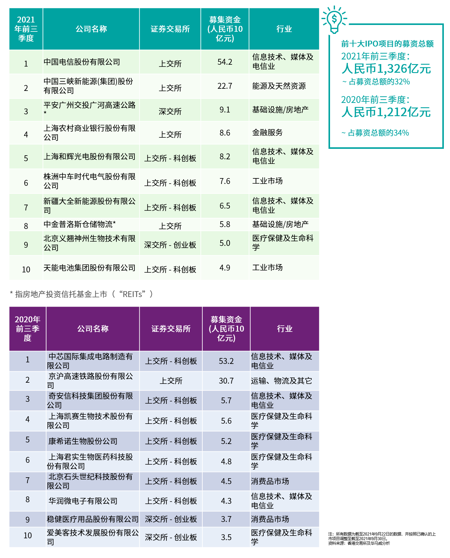 得益於內地本土經濟逐步復蘇及註冊制上市制度的推動,A股IPO市場繼續表現活躍。2021年前三季度,一家內地電信公司成功在上海證券交易所上市,募資總額達人民幣542億元。這是2021年前三季度全球募資金額最大的IPO。由於科創板和創業板仍然受歡迎,A股市場的募資金額創歷史新高。