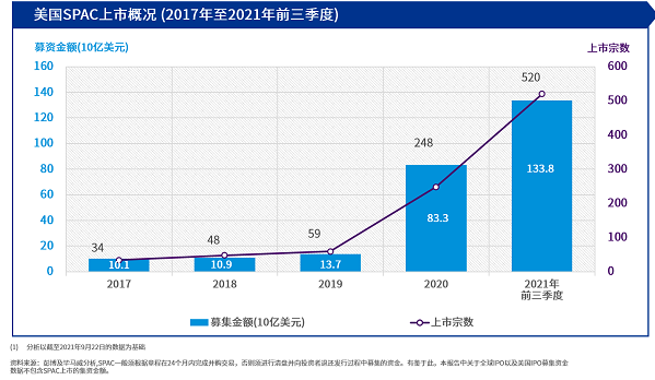 隨著監管機構對SPAC的監管審查日趨嚴格以及投資者興趣減退,最近幾個月,SPAC上市步伐放緩,自2021年4月以來共募集資金340億美元。然而,由於2021年第一季度的強勁表現,SPAC市場在2021年前三季度仍創歷史新高,募資總額達1,338億美元。