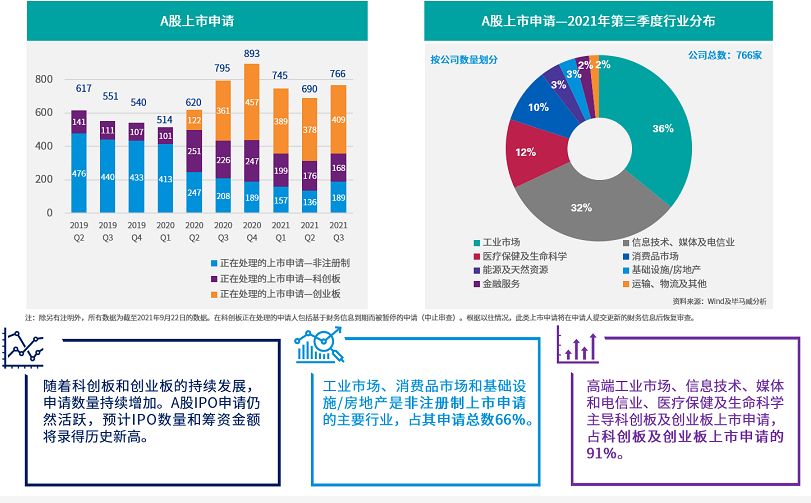 上市申請仍然活躍,目前約有766間公司申請上市,當中主要涉及科創板和創業板的上市申請,反映其上市機制深得市場的信心及認可。資訊技術、媒體及電信業和高端工業市場占上市申請總數的68%,預計仍將是A股IPO市場的主要驅動力。