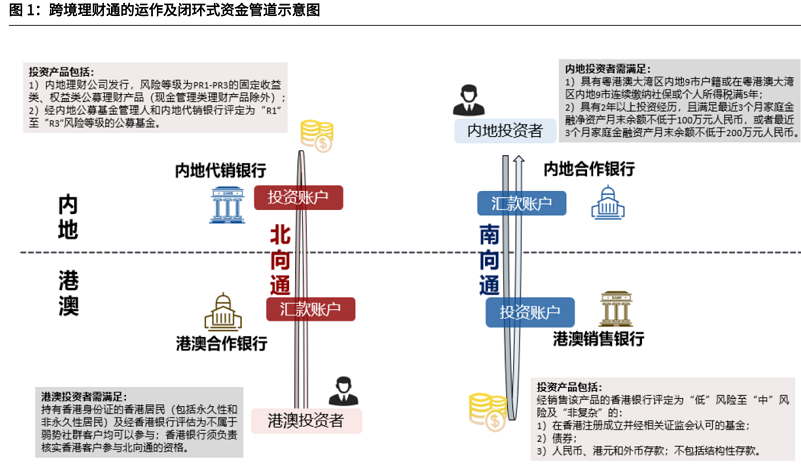 根據《實施細則》,“跨境理財通”指粵港澳大灣區內地和港澳投資者通過區內銀行體系建立的閉環式資金管道,跨境投資對方銀行銷售的合資格投資產品或理財產品。按照投資者身份不同,該業務又被劃分為“南向通”和“北向通”。其中,區內銀行必須是大灣區內地九市註冊法人銀行或分支機構,或在港澳註冊的銀行。此外,根據三地監管規則,試點銀行還需滿足內控制度、風控體系、技術條件等要求才能申請開通“跨境理財通”業務。