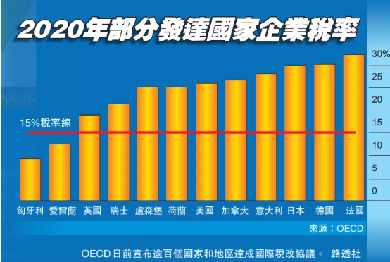 據新華社昨日報導,OECD此次推出的方案是重新分配跨國企業利潤徵稅權和設立全球有效最低稅率的雙支柱包容性框架,以打擊避稅港,應對經濟數碼化帶來的稅收挑戰,這被視為一個世紀以來最大企業稅改革。該組織說,這一方案的支柱一將確保規模最大、利潤最豐厚的跨國企業利潤和徵稅權在各國之間更公平地分配。新規則要求跨國企業在其經營活動所在國納稅,而不僅僅是在其總部所在地。支柱二是將全球最低企業稅率設為15%。從2023年起,年收入超過7.5億歐元(約67億港元)的公司都將適用這一稅率。