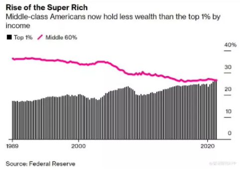 美國中產階層財富在全美總財富中占比逐年下滑,據彭博社報導,收入排在前1%的美國人擁有的財富,已經超過了全部美國中產階級,這是美國歷史上的首次。