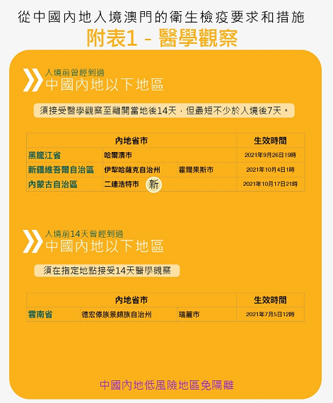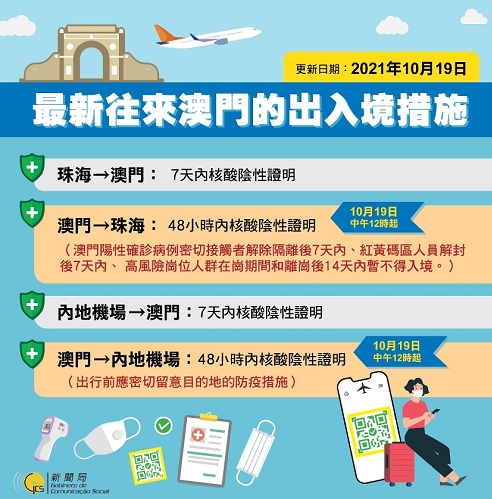2、從澳門回內地:經珠澳口岸入境從10月19日中午12點起不需要隔離;澳門直飛其他省份暫無限制(不同城市有不同要求)。無論還陸路、航空還是乘船,離澳需持48小時內核酸陰性證明。