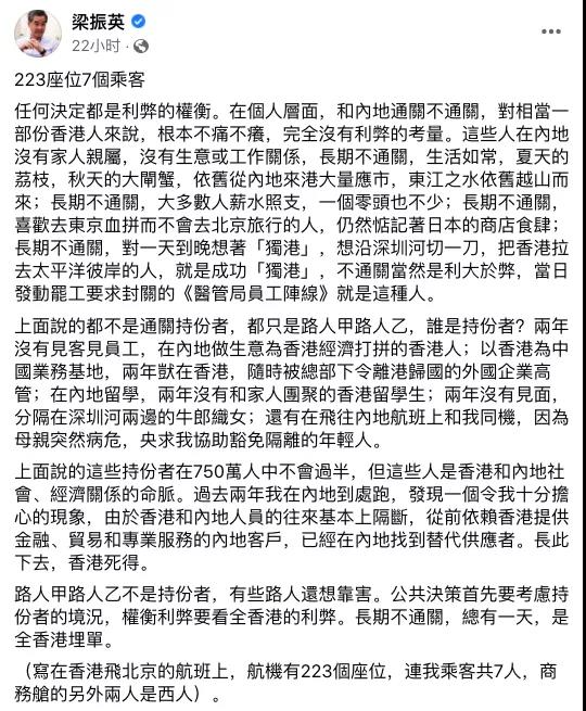 全國政協副主席梁振英昨天發表帖文表示,和內地通不通關,對一部分香港人來說,不痛不癢,生活如常,他們也不是“通關的持份者”。