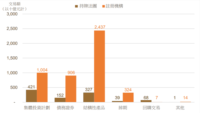 在總交易額中,以結構性產品(2.764萬億元)所佔的比例最高,其次是集體投資計劃(1.425萬億元)和債務證券(1.058萬億元)。是次調查的主要觀察結果包括: