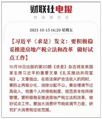 10月16日出版的《求是》雜誌發表重要文章《扎實推動共同富裕》。文章指出,要積極穩妥推進房地產稅立法和改革,做好試點工作。